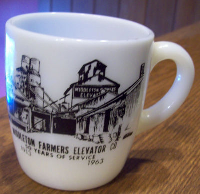 Old Milk Glass Middleton Farmers Elevator MI 1913 1963 Anniversity Coffee Cup