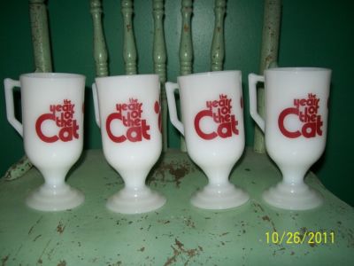 SET OF 4 1970,s VINTAGE ARTIC CAT YEAR OF THE CAT MILK GLASS EXCELLENT SHAPE