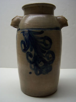 RARE! ANTIQUE BLUE DECORATED CROCK BEARDED MAN HANDLES