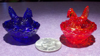 Title (ebay affiliate link): WESTMORLAND PAIR OF MINI COBALT AND RUBY RED HEN ON A NEST NO RESERVE