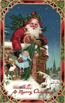 Title (ebay affiliate link): Santa Claus Climbing in the Chimney with Presets, comic old embossed postcard