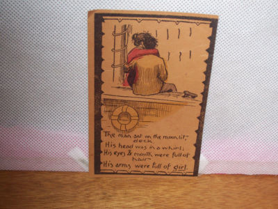 Title (ebay affiliate link): THIN HAND-COLORED LEATHER POSTCARD "LADY & MAN SITTING ON RAILING OF A SHIP!!!!"