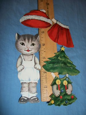 Title (ebay affiliate link): Antique Paper doll, cut outs, Grey Cat with Christmas clothes , Die Cut ephemera