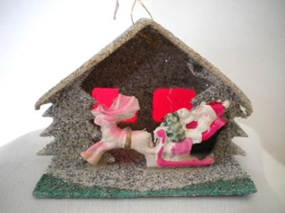 Title (ebay affiliate link): VINTAGE CHRISTMAS PUTZ MINIATURE MICA HOUSE W/ CELLULOID SANTA & SLEIGH ~ JAPAN