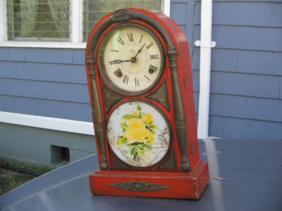 ANTIQUE 17 1/2" TALL SHING LEE(CHINA) CLOCK //RED PAINTED WOOD W/BRASS MEDALLION