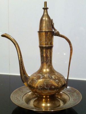 Brass Indian Teapot Ornate and round tray base. Approx 9" in height