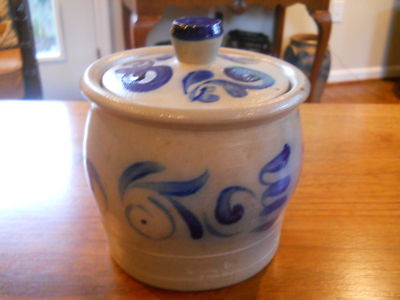 Antique Stoneware Cobalt Blue Salt Glaze Crock Pot with Lid