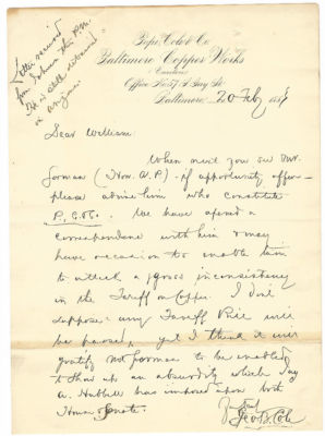 Title (ebay affiliate link): 1887 POPE, COLE & CO. BALTIMORE COPPER WORKS SEN. GORMAN REFINING TARIFF LETTER