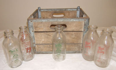 Title (ebay affiliate link): 5 Old dairy milk bottles w wooden crate Vermont Country Egg Nog Ross Blueberry H