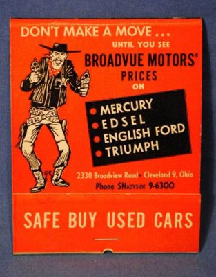 Title (ebay affiliate link): 1959 Mercury Broadvue Motors Dealer Oversized Matchbook Edsel Triumph Unused