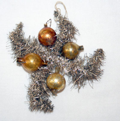 Title (ebay affiliate link): Early 1900s Tinsel & Four Gold Glass Beaded Xmas Ornament. German