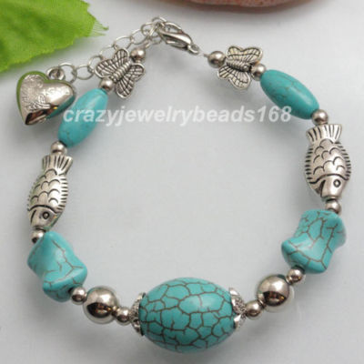 Antique Silver Metal Turquoise Beads Gem Bracelet Charm Z053
