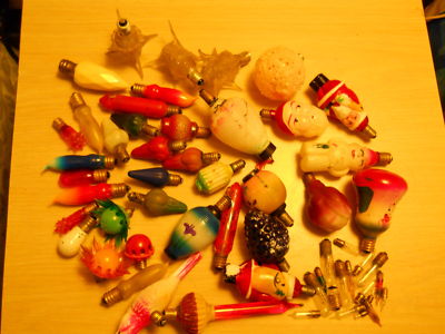 Title (ebay affiliate link): 54 Vintage C-6 & C-7 tree bulbs - Santas Snowman Lanterns Bird Grapes Bell Flame