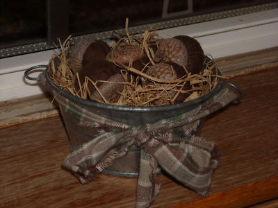 primitive h.m. acorns,small metal washtub/fillers/fabric/fall/gift