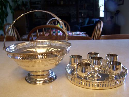 Title (ebay affiliate link): 8 Pc. Silver Plate Set India 6 Cordials Tray Basket NEW