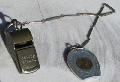 VINTAGE POLICE SPECIAL WHISTLE WITH ONE CENT KEY CHAIN GOOD LUCK CHARM / NR