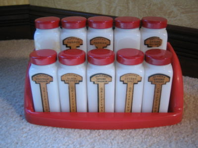 Vtg GRIFFITH Red/White SPICE RACK 10 Milk Glass Jars