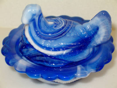 COBALT MILK SLAG GLASS HEN CHICKEN ON NEST BASKET DISH