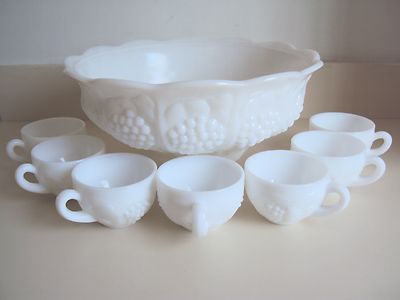 VINTAGE MILK GLASS GRAPES PUNCH BOWL SET