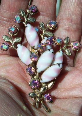 Title (ebay affiliate link): VINTAGE ANTIQUE PINK & WHITE STRIPED MILK GLASS FLOWER BROOCH PIN 1940'S !!