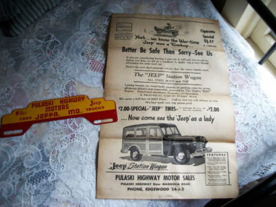 VINTAGE 50s JEEP WILLYS DEALERSHIP ADVERTISEMENT+ METAL TAG