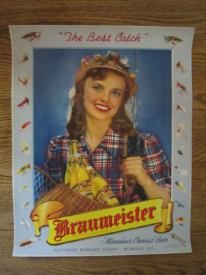 Title (ebay affiliate link): BRAUMEISTER BEER FISHING GIRL & LURES ADV. MILWAUKEE BREWERY VINTAGE 1950's