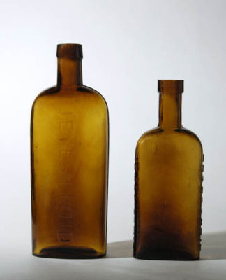 old British Victorian oval amber glass bottle x2, JEYES FLUID, 1890-1900