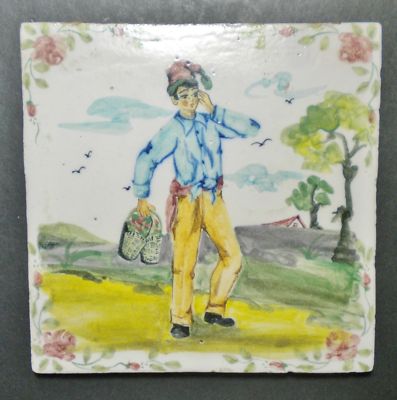 Title (ebay affiliate link): OUR BEST FRENCH HAND PAINTED FAIENCE ARCHITECTURAL TILE MAN w FLOWER BASKETS