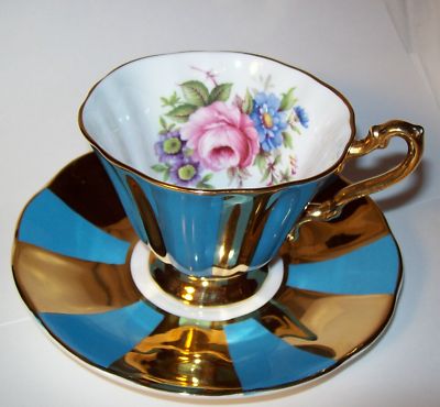 Title (ebay affiliate link): Vintage Unique Tea Cup and Saucer Rosina England Pink Rose Blue Gold