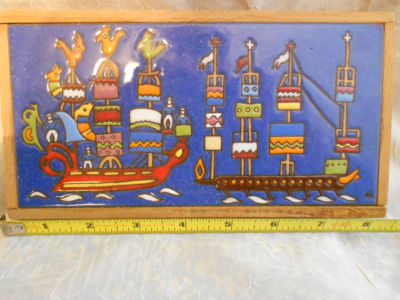 Super Multi Colored Vintage Arts and Crafts Tile Plaque 2 Viking Ships 8x4 NICE