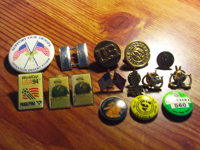 Title (ebay affiliate link): 15) Assorted Pins & Buttons- WW2, Political,Police Buttons,Desert Storm++