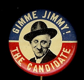 Title (ebay affiliate link): GREAT 1952 GIMME JIMMY! JIMMY DURANTE THE CANDIDATE PICTURE BUTTON