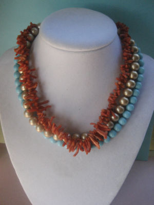 VTG Branch Coral turqoise milk glass and glass pearl 3 strand necklace