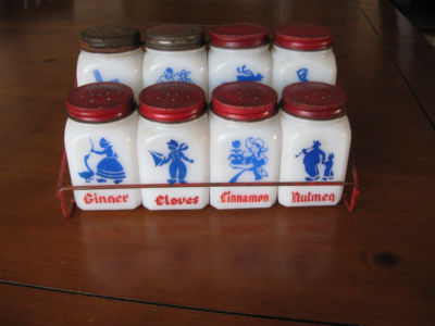 Title (ebay affiliate link): Vintage milk glass Dutch people spice jars and red rack holder LQQK