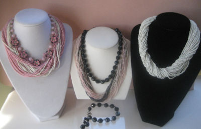 Title (ebay affiliate link): VTG 5 necklace/bracelet lot pink enamel/glass jet glass seed bead milk glass