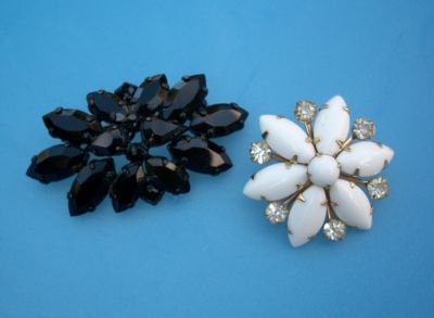 Title (ebay affiliate link): 2 VINTAGE Opaque Rhinestone Pins 1 Black & 1 White Milk Glass ~ West Germany