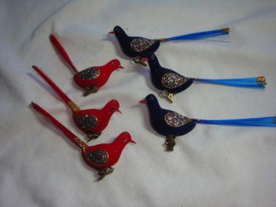 Title (ebay affiliate link): 6 FLOCKED Clip-On Vintage Long Tail BIRD CHRISTMAS ORNAMENT ~ Red & Blue