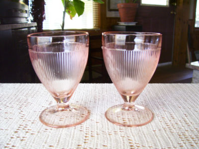 Title (ebay affiliate link): 2 Pink Jeannette Glass Homespun "Fine Rib" Footed 5 oz. Juice Tumblers