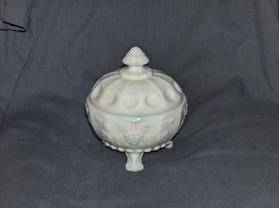 Title (ebay affiliate link): WHITE MILK GLASS WHITE GRAPES AND VINE CANDY NUT DISH COVERED LID EXC CONDITION
