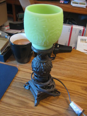 Title (ebay affiliate link): ANTIQUE GREEN MILK GLASS LAMP SHADE-FLORAL IMPRINT-OPAQUE-USED LAMP