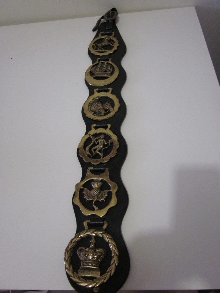 x6 VINTAGE HORSE BRASS ON LEATHER MARTINGALE BRASSES ENGLAND BEL 1 0F 2