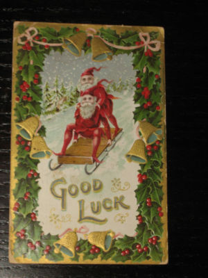 Title (ebay affiliate link): OLD 1908 VINTAGE SANTA CLAUS CHRISTMAS GOOD LUCK POST CARD RETRO ELVES SLEIGH