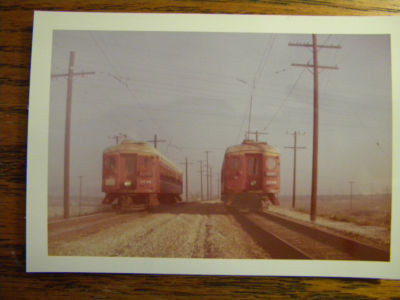 Title (ebay affiliate link): Pacific Electric Railroad Cars Meet Between LB & LA Bound Rails Color Photograph