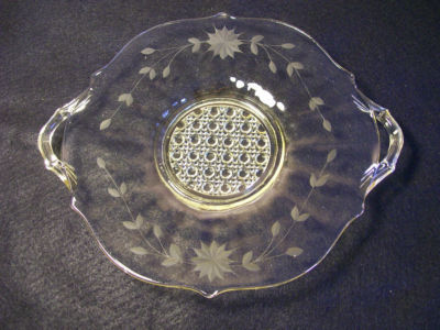 Title (ebay affiliate link): Jubilee 2 handled etched cake plate by Lancaster Glass Co. in yellow