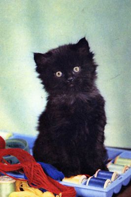 Title (ebay affiliate link): VINTAGE DIXON postcard of BLACK KITTEN CAT IN SEWING BOX