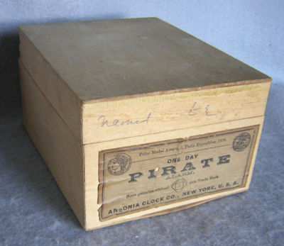 Antique Ansonia Pirate Alarm Clock Wood Box with Labels