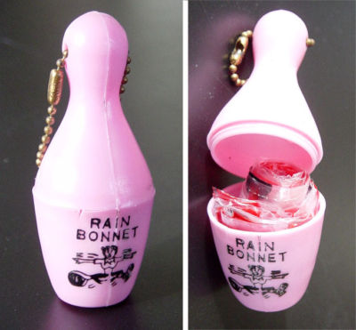 Title (ebay affiliate link): Vintage Bowling Pin Keychain w/ Plastic Rain Bonnet
