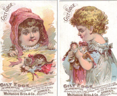 2 Trade Cards Girls Dolls Kitten Gilt Edge Shoe Gloss c1880