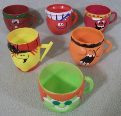 Title (ebay affiliate link): 6 VINTAGE 1960s PILLSBURY FUNNY FACE PLASTIC MUGS CUPS F & F MOLD