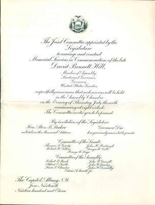 1911 Invitation To Memorial For David Bennett Hill Governor Of New York State
